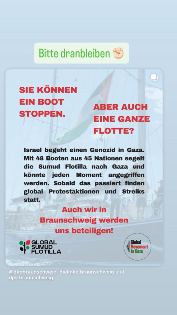 Zeitgleich mit der Überfahrt nach Gaza werden weltweit zahlreiche Unterstützungsproteste stattfinden. Auch wir in Braunschweig werden uns beteiligen! Auch hier kannst du dich einbringen. Mach auch Druck bei deinen Abgeordneten!